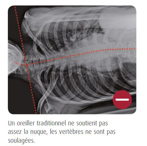 • Un oreiller classique n’assure souvent qu’un soutien partiel de la nuque, laissant les vertèbres dans une position non physiologique, ce qui peut provoquer douleurs et tensions.